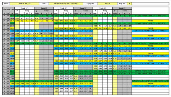 All characteristics of the mixture in real operating conditions are determined using the monitoring data of cargo operations (screenshots on Figure 3 and Figure 4). Gas parameters before the mixing process are presented in Table 1. The cargo weight before mixing is presented in Table 2. It should be noted that, structurally, the tank capacity is divided by a vertical impermeable partition into two compartments (port side and starboard side), which are interconnected by holes in the dome (Figure 2).