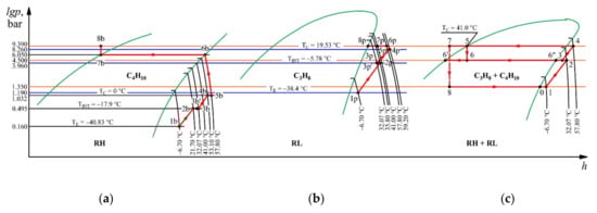 Processes occurring with working fluids in equivalent cycles in comparison with the main processes occurring in the mixture in the lgp–h diagram: (a) processes with butane; (b) processes with propane; (c) processes with a mixture.