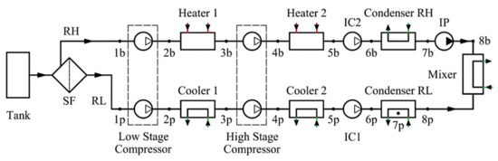 At the discharge of the high-stage compressor (Figure 6), the mixture consists of the liquid phase of the RH component (state 8b) and the vapor phase of the RL component (state 7p). If there is a leak in the discharge line of the high-stage compressor, the RL component may leak, and the presence of this leak is indicated by a pressure drop in this line. The partial pressure of the RL component at the suction to the low-stage compressor (state 1p) exceeds the atmospheric pressure and thereby increases the likelihood of its leakage. The result of the analysis shows the possibilities of the practical application of the equivalent model in similar operating conditions.