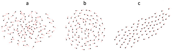 We rely on the same two measures that were used in [12,31] to quantify the group types produced in the simulations: the polarization and the rotation, or normalized angular momentum, . If we denote the number of particles by N, the current normalized heading of particle i by , and the normalized vector from the center of mass of all particles towards particle i by , then the polarization is defined by