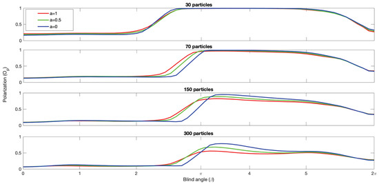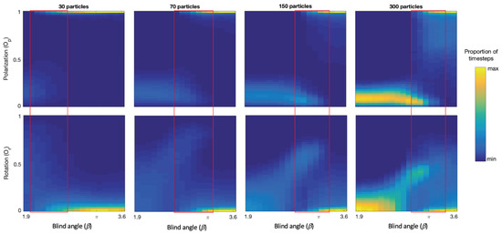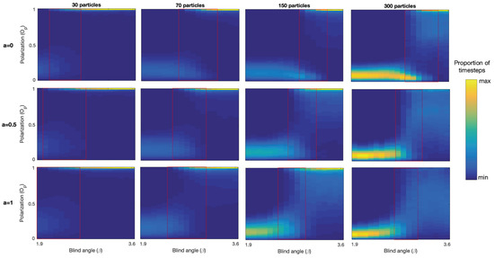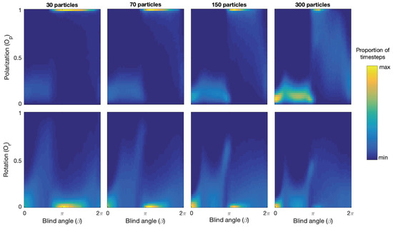 Following previous experimental [12] and modeling [31] work involving this system, we performed simulations for each of the group sizes 30, 70, 150 and 300. However, unlike previous models [29,31] that used a single fixed blind angle of , here we ran simulations for each value of the blind angle from 0 to 2 in increments of 0.1 to create density plots showing the recorded polarization and orientation values in simulations of timesteps for each value and for each groups size. This was then repeated for each group size for three different alignment parameter values , and to investigate how adding alignment influences the model behavior as a function of . In all simulations except those described in the next sentence, the particles move in a bounded rectangular area of size units of length, mimicking the setup in [12,31]. To determine if varying the size of the region critically affects the behavior under study here, we also ran simulations with 70 particles with the dimensions of the region being scaled by 1/3, 2/3, 4/3, 5/3, 2,5 and 10. The same slip boundary conditions used in [31] were used here, that is, if a particle’s preliminary positional update in a timestep would make it cross the boundary, it aligns its heading with the boundary in the direction that deviates the least from its approach angle. Each particle was assigned a random position and heading at the start of each simulation (random initial conditions) and all auxiliary parameters were kept as in [22], i.e., “, , , , ”. To determine whether the initial conditions affect the behavior under study here, we also ran 12 different timesteps in simulations with 70 particles to compare the outcome of one simulation and the average of the 12 simulations.