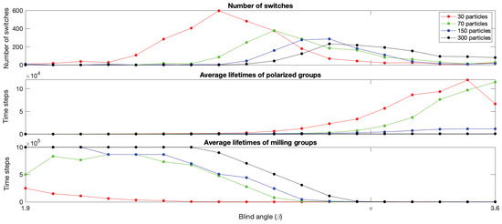 There is a range of values over which the model generates bistability with continuous switching between polarized groups and mills. See red rectangles in Figure 3. We observe that bistability is present because both the polarization and rotation measure show two bands of returned values for each value in these ranges. For example, around for 150 particles we see a band near (polarized group) and another band near (mill), and in the corresponding rotation plot we see one band near (polarized group) and another one around (mill). We note that as increases in the bistability regions the proportion of timesteps where polarized groups were detected increases, and that as decreases the proportion of milling increases. We also note that the location of the bistability region is shifted towards higher values with increasing group size. More specifically, for 30 particles the region range is = 2.0–2.8, 70 particles = 2.6–3.2, 150 particles = 2.8–3.3, 300 particles = 2.9–3.4. Figure 4 shows the number of switches and the average lifetimes of polarized groups and mills as a function of near the bistability region for each group size and confirms that switching is taking place and provides quantitative estimates of the and group size-dependent switching rates, group type lifetimes, and location of the switching regions.
