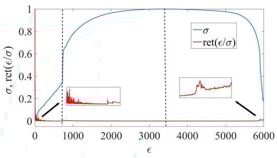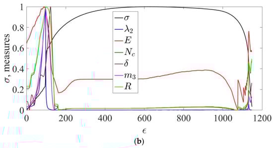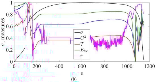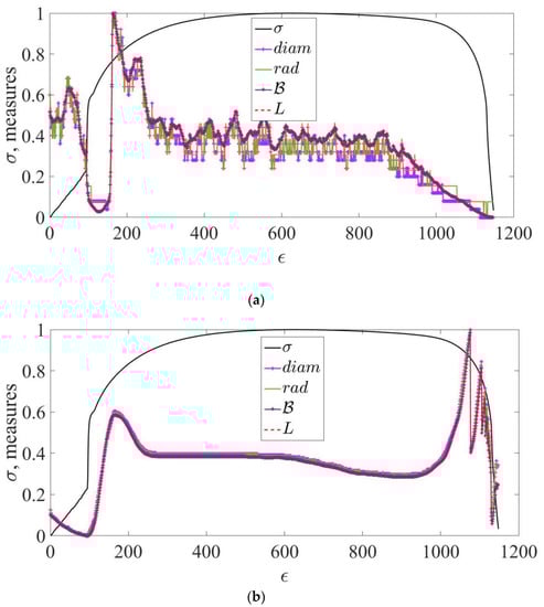 The choice of the recurrence threshold parameter has been extensively studied in the literature [,,,]. Often, the decision of selection of the recurrence threshold depends on the data analyst himself and his understanding of the system being studied. Choosing , will cause our network to be very sparsed. If , the network will be highly connected. Studying the dynamics of the stress–strain curve with the sliding window procedure, we need to be adaptable to the structure of the studied subspace of the system. Starting the selection of from very large values will cause a high dense edge distribution of the network. Such a large amount of less important interconnected nodes will hide all feasible information about the studied system. The necessary information is best preserved when the threshold is sufficiently small, whereas the choice of sufficiently large would be effective for dealing with noise []. It is worth considering that the studied series is not smoothed: the transition from elastic to plastic deformation and the stage of fracture have very high rises and falls in the fluctuations of their initial values and returns. This can break the connections between different components of the series since the distance between points that characterize those stages and the points of other areas would exceed []. These unconnected components would make the shortest path length that would cause problems with the computation of some graph-based indicators.