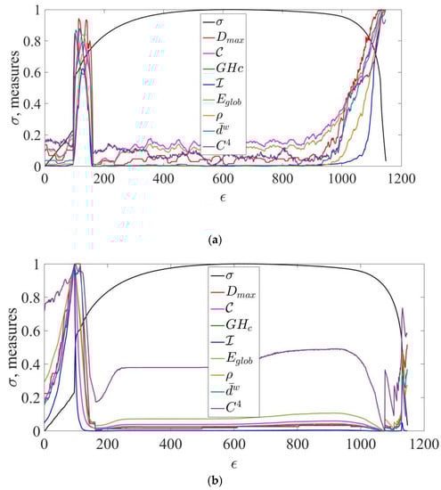 All of the presented measures were calculated with the sliding window approach [,,,,,,,,,]. In accordance with the technique, we emphasize the fragment of predetermined length in which the computation of the relevant measure is obtained. The series is then moved forward in time by a predetermined time step, and the process is repeated until all of the series’ elements have been used. We may examine changes in system complexity by comparing the estimated measure of complexity and the actual time series of the stress–strain curve. All of the presented measures are calculated with the window size and step size that corresponds to the separation between each window.