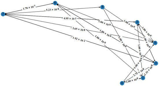Figure 1 shows a graph that was created from the dynamical system (1), considering A as an adjacency matrix representing the topology of a network. The random feature set in Table 1 was also assigned to each node as attributes. It should be noted that the coefficient matrices of B, C, and D in the dynamical system (1) were not utilized to construct the graph. Instead, the adjacency matrix representing the topology of a network was created based on the coefficient matrix of A. The A matrix in the state-space representation does play a central role in determining the dynamics of the system, as it describes how the system evolves over time. The other matrices, such as the input, output, and feedforward matrices, often describe the relationships between the inputs, outputs, and states of the system but may not directly determine its dynamics.