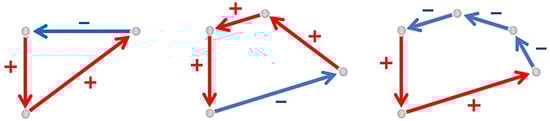 Examples of imbalanced motifs with different orders. According to the structural balance theory, loss of balance can occur when the multiplication of the signs of one cycle becomes negative.