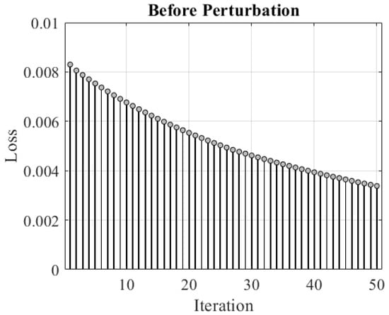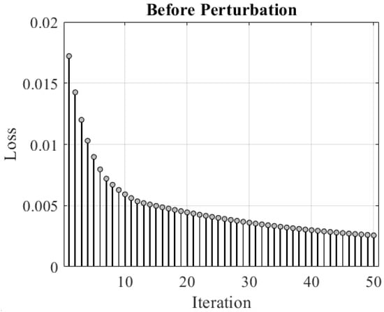 Figure 5 and Figure 6 show the training loss as a function of iteration numbers for two scenarios, namely, without and with perturbation. In both scenarios, the training loss approximately converged to a loss value of 0.0028 after 500 iterations, confirming the robustness of an AGCN model to feature perturbation.