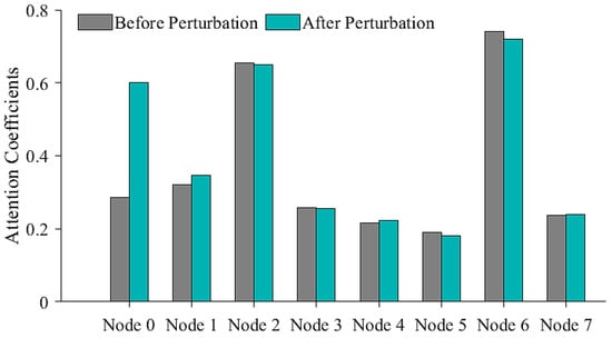 Comparing attention coefficients of each node for the scenario with and without perturbation on node 0. Nodes 2 and 6 are the ones that need more attention.