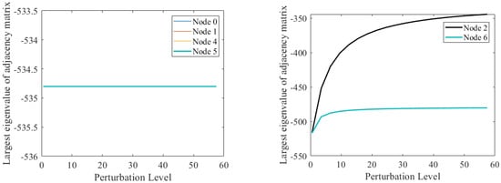 The effect of structural perturbation on the largest eigenvalue of the adjacency matrix. The perturbation level was initially set to 0.5 and gradually increased by step 3. Driving to zero by increasing the perturbation level only occurred for the largest eigenvalues of nodes 2 and 6.