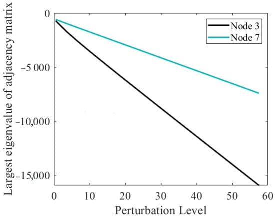 To test our hypothesis and check the effect of each node on the stability of the network, we looked at how the perturbation in one column of the adjacency matrix [9] reflected in its largest eigenvalue. To verify the need for unstable nodes for more attention, we performed spectral stability analysis and calculated the change in the largest eigenvalue of the adjacency matrix by increasing the perturbation level. Figure 8 shows how different nodes in the graph responded to an increase in the perturbation level. As seen in Figure 8, nodes 2 and 6 are those that may move the system towards instability because the largest eigenvalue gets closer to zero as the perturbation level on these nodes increases.