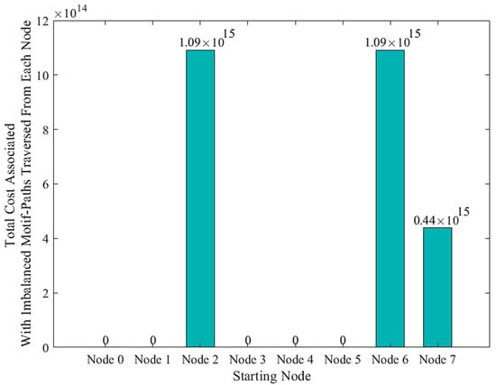 The influence of each node on the stability of the network can be determined by the number of times that a node appears in the imbalanced motifs. To better quantify this influence, a measure is defined that not only considers the imbalanced motifs with different orders but also considers the weights of paths which form a cycle within these motifs. For each node and for each imbalanced motif of size 3 that includes that node, the weights of the paths are multiplied and then added together. The same procedure is repeated for the imbalanced motifs of sizes 4, 5, and 6. The cube root of absolute value for the multiplication of these three calculations is then calculated, and the total cost associated with that node is obtained as follows: