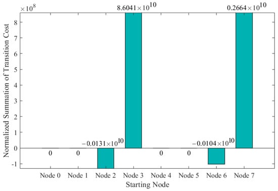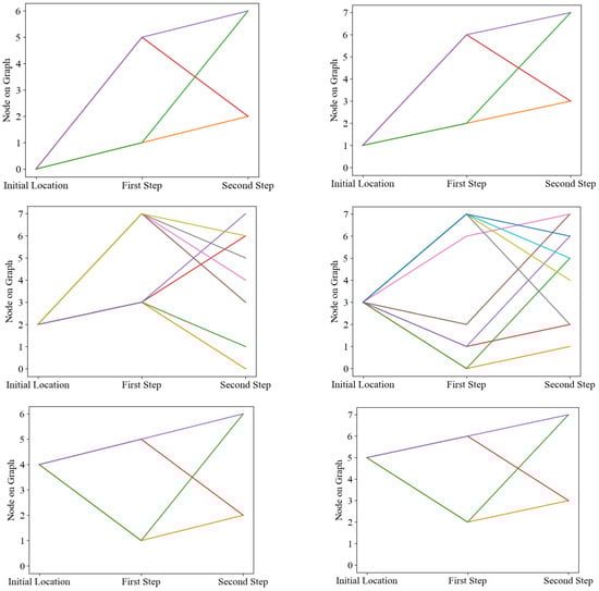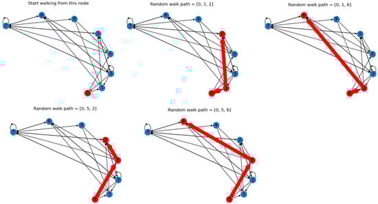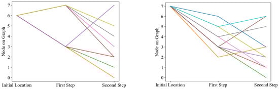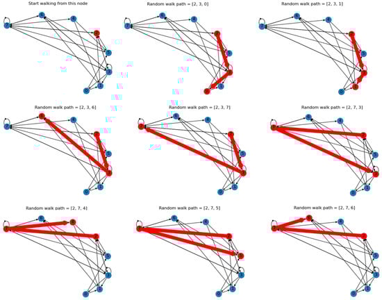 In symmetry-breaking stability analysis, the following calculations are the process of computing the spreading ability of each node based on Equation (7). Figure A1 shows one example of the path’s weights traversed during a single random walk.