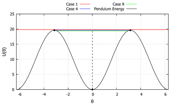 The internal energy function U of the nonlinear pendulum is shown in Figure 2. Three initial conditions, corresponding to cases 1, 4 and 9 from Section 2.2.1, Section 2.2.4 and Section 2.2.9, respectively, are considered in order to highlight the capabilities of the developed exact solution in extreme cases. Considering the downward initial position , the critical initial velocity that brings the pendulum to the upward position () can be obtained from Equation (90):