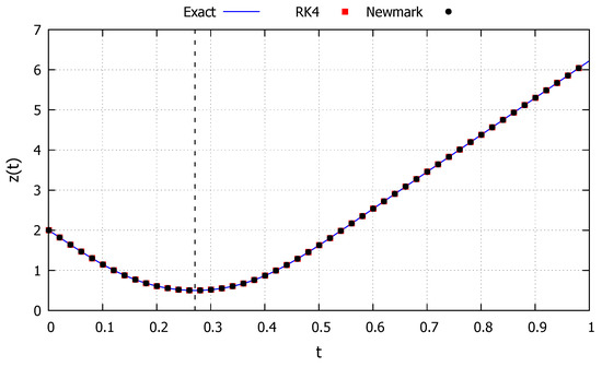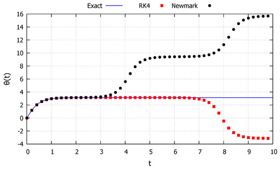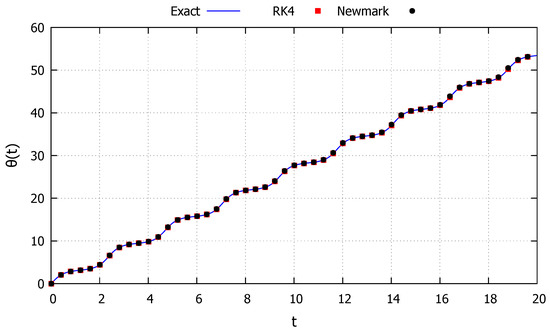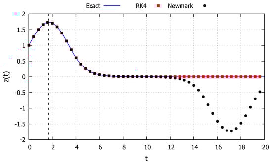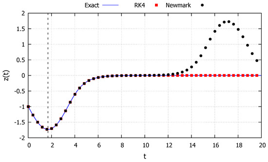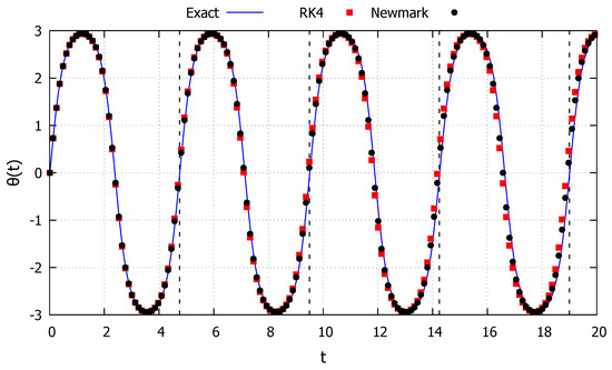 Although the two numerical methods appear to drift by the same amount, in Figure 4 the red (RK4) and black (Newmark) points vary for the same values of the parameter t, and for these points start to visibly differ from one another, indicating loss of accuracy of the numerical methods. Moreover, the accuracy of the exact solution can be verified by the dash lines indicating the period of the response. Since the energy provided by the initial conditions in this case is smaller than the critical one, the solution must always be periodic. Until the second dashed line (), all solutions have approximately the same period. However, after this point, the solutions from the two numerical methods (via drift errors) have a smaller period, while the response from the exact solution maintain the original period.