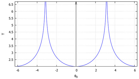 For a null initial velocity (), the response of the system is always periodic, falling in case 4 of Section 2.2.4. The period of the response can than be calculated as a function of initial positions as shown in Figure 5. These calculations are performed without the need of computing the time response of the system in advance and highlight an advantage of exact methods.