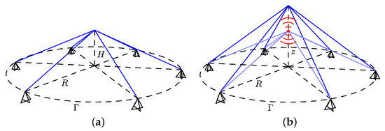 The next example studied in this section is the nonlinear pyramidal truss (Figure 7). The truss consists of n bars attached to central point, at a height H, that can only move vertically (z) and are blocked in the base, that forms a circle with radius R. The central point is subjected to the tension force of all the bars. The bars have a section with area A and are made of a material with elastic modulus E and specific mass . The natural frequency of the system in the reference configuration is then given by [17]