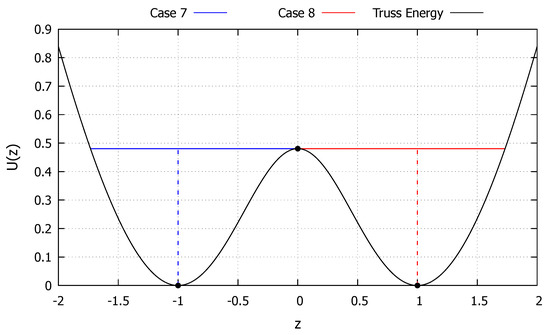 The internal energy function U of the nonlinear pyramidal truss is shown in Figure 8. Two initial conditions, corresponding to cases 7 and 8 from Section 2.2.7 and Section 2.2.8, respectively, are considered in order to highlight the capabilities of the developed exact solution in extreme cases. The truss has three static equilibrium points, that is, zeros of the force function f. The equilibrium points are stable, while the equilibrium point is unstable, as indicated by the curvature of this points in Figure 8. Starting from any of the stable equilibrium points () the critical velocity required to reach the unstable equilibrium point () can be obtained: