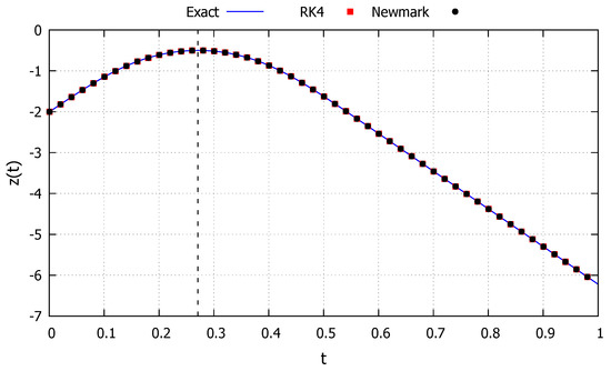 The second initial condition studied is taken as and , corresponding to an energy level that makes the system reach the minimum point and is represented by the red line in Figure 11. The system is capable of fully absorbing the energy level only to a point to left of the initial condition, corresponding to the behavior described in Section 2.2.3. The results obtained with the developed exact solution, the Newmark and RK4 methods are shown in Figure 13. As can be observed, the developed exact solution shows a good agreement with the numerical methods and represents well the general parabolic behavior. Moreover, the dashed black line in Figure 13 represents the time s to reach the maximum value, calculated via Equation (42), showcasing its accuracy.