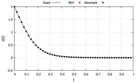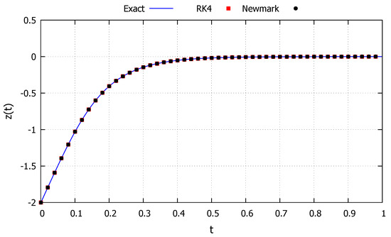 The fourth initial condition studied is taken as and , corresponding to an energy level equal to the critical one, making the system approach the critical point and is represented by the magenta line in Figure 11. The system is never capable of fully absorbing the energy level but approaches such a point to left of the initial condition, corresponding to the behavior described in Section 2.2.6. The results obtained with the developed exact solution, the Newmark and RK4 methods are shown in Figure 15. As can be observed, the developed exact solution shows a good agreement with the numerical methods and represents well the general asymptotic behavior.