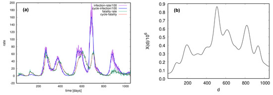 Considering a single country, a typical fatality rate time series exhibits cycles mainly induced by primary cycles in the infection rate time series. To elucidate their sequences, here, we show an example of the recorded infection and fatality rates in Serbia; the data are available at https://github.com/CSSEGISandData/COVID-19/ (accessed 19 January 2023). These time series for the entire period of the pandemic are shown in Figure 1a, together with the corresponding cyclical trends. We calculate the cross-correlation between signals and representing the cycles of fatality and infection rates, respectively. The cycle signal for the number of infected is divided by 100, so it has the same scale as . The cross-correlation as a function of time lag d is shown in Figure 1b; the cycle for the number of fatalities is following the infection cycle, with pronounced similarities between them occurring at . The highest cross-correlation appears for time lag .