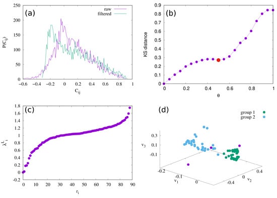 The elements of the adjacency matrix of this undirected unweighted correlation network are defined as when , and zero otherwise. The threshold parameter is determined based on the spectral properties of the two cut matrices and . In particular, we calculate the eigenvalue problem of the matrices for values of with step and determine the Kolmogorov–Smirnov (KS) distance between the spectra of each of these matrices and the spectrum of matrix ; see Figure 2b. A non-zero value of for which we observe a local minimum of the KS distance curve—here, , indicated by the red dot in Figure 2b—is elected as a suitable threshold.