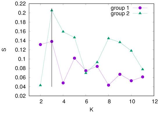 Silhouette coefficient S vs. the number of clusters K in two groups of time series, described in the text. The vertical line at indicates the optimal partitioning of each group into three clusters.