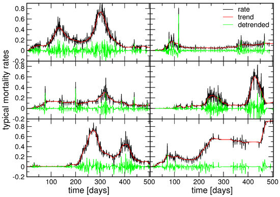 Data. We downloaded the publicly available data on the number of fatalities for 265 countries and regions from https://github.com/CSSEGISandData/COVID-19/ (accessed 24 March 2022). The period is approximately two years, i.e., from the day of the first registered casualty, which is different for each country or region, until 24 March 2022. However, the number of time series is significantly shorter. For these reasons, we select countries and regions with a length of at least 500 days, i.e., 228 time series. The shortest time series has a length of 511 days. Thus, we cut all other time series to 511 days starting from their beginning. Moreover, a considerable number of time series out of 228 selected ones have a large number of days with zero casualties; they are less suitable for analysis, and thus we choose ones with at least 60% non-zero entries. In the end, we have a set of 96 different time series with a length of 511 days.