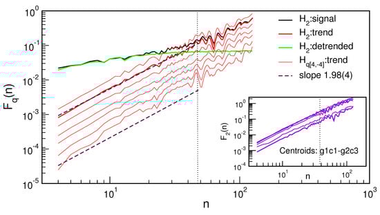 Considering the fluctuations around cyclical trends for these six centroids, we determine the fluctuation function vs. time interval n, defined in Equation (2), and extract its apparent scaling properties to determine the spectrum of generalised Hurst exponents for a range of values of q. As stated above, in the case , the function describes the standard deviations with the common Hurst exponent . In Figure 5, we first show that for the cycles with an ascending trend, in the case of the cluster g2c3, the standard Hurst exponent , and the fluctuation function is monofractal. Similarly, this applies to the trends of other centroids in the group g2; meanwhile, is found for the strongly irregular cycles in the centroids of g1; see the inset in Figure 5. The multifractal measures of the fluctuations around these cycles are discussed in the following; see Figure 6 and Figure 7.