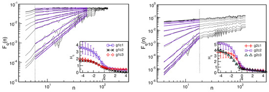 The function vs. n for different q for the fluctuations around cyclical trends for two representative cases with a diverse range of scales indicated by thick purple lines: g1c2 (main panel left) and g2c2 (right). Insets show the spectrum of generalised Hurst exponents vs. q for three clusters in each group, as indicated in the legend.