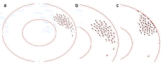 - As the group of particles approach a specified point with coordinates located inside the annular region ahead of the moving group, a predator attack is simulated at a specified time . All particles that are within a distance of from the predator attack point detect the predator when it becomes active at time and are strongly repelled directly away from it. See Figure 1b,c. More specifically, if a particle i is within of the predator point, its heading update has an additional predator evasion term added to Equation (1) in [43]. The most general form of the heading update formula used here iswhere is particle i’s current heading, is the normalized direction towards the local center of mass of its neighbors except those in the blind zone, is the normalized average heading of its neighbors, is a local distance dependent repulsion term, is the repulsion directly away from the predator, is a heading noise term, and the parameters a, b, c, e, r, specify the relative strengths of the different interaction terms. For a detailed description of all terms except the predator repulsion term see [43,44]. The predator repulsion term has exactly the same form as the local repulsion term , but is calculated using only the predator coordinate instead of the coordinates of all neighbors of the particle;