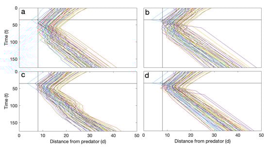 Alignment interactions are not required to induce collective predator evasion in moving groups. Attraction and repulsion alone are sufficient. Figure 2a,b shows the distance d from the predator to each particle over time in the alignment-free model, and Figure 2c,d show the corresponding trajectories in the alignment-based model. In all cases, we note that all particles approach the predator location, the predator is activated at and at this time, the few particles that are within a distance of from the predator move directly away from it and influences the other particles, which have not detected the predator, to turn until the whole group has turned and collectively move away from the predator, and, while there are noticeable differences between the trajectories in the different panels, the basic dynamics are the same, implying that alignment is not strictly required to induce this phenomenon.