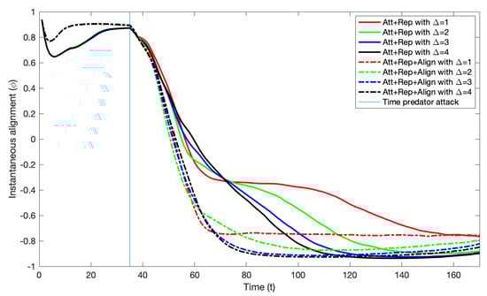 Comparison of the average instantaneous alignment () over time for the eight different cases. Solid curves correspond to attraction and repulsion only, dashed lines correspond to alignment included. Curve color indicates the speed difference (red), (green), (blue), and (black). The horizontal line represents the predator attack time and we note that at this time, all curves drop rapidly from a high . Initially, all curves drop at comparable rates but as time progresses, the alignment curves drop quicker, especially when the drops below −0.2, i.e., after the average heading of the group has turned away from the direction of the predator. We also note that these are averages and that the successful turn rate is significantly lower for the smaller speed differences than the higher (Table 1), which contributes to the flattening out of the green and red curves (due to failure to turn, splits, etc). See Video S1 for example simulations of each of the eight cases.