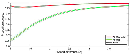Evasion success as a function of speed difference. The green curve shows the mean evasion success proportion for the attraction-and-repulsion-only model, and the red curve the mean evasion success proportion for the attraction, repulsion, and alignment model. The black lines represent the 95% bootstrap confidence intervals.