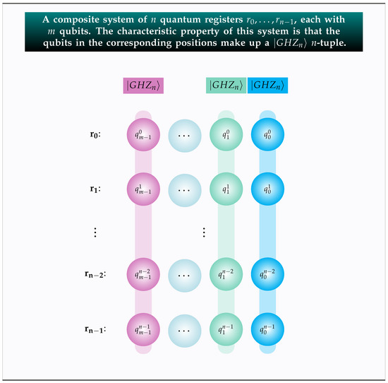 Figure 1 illustrates this setting, with the corresponding qubits belonging to the same n-tuple colored identically. This composite system is made of qubits as each of the n registers holds m qubits. We point out that it does not matter in the least whether the registers are all in the same place or are all in different spatial locations. The power of the entanglement effect, stemming from the mn-tuples, will instill the necessary correlation, irrespective of whether the composite system is localized or entirely distributed. It is precisely this unique effect of entanglement that allows us to envision the whole setting as a unified system.