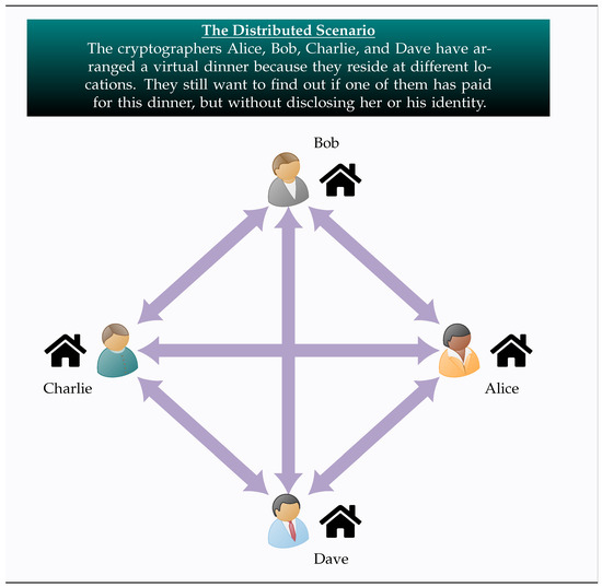 The above figure illustrates an example of the distributed scenario. Four cryptographers, Alice, Bob, Charlie, and Dave, have arranged a virtual dinner using state-of-the-art technology because they are at different geographical locations. Of course, they still want to find out if one of them has paid for this dinner, but without disclosing her or his identity.