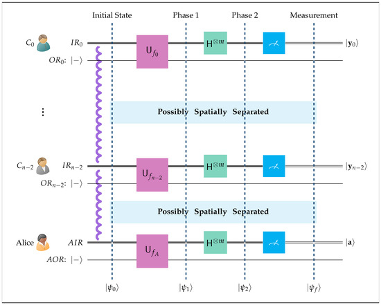 - In addition to her input register, Alice utilizes a single-bit output register designated by in Figure 4, which is initialized at state . Likewise, all her cryptographer colleagues , , possess a similar single-bit output register denoted by in Figure 4. The output registers are crucial for the embedding of private information into the entangled state of the composite circuit.