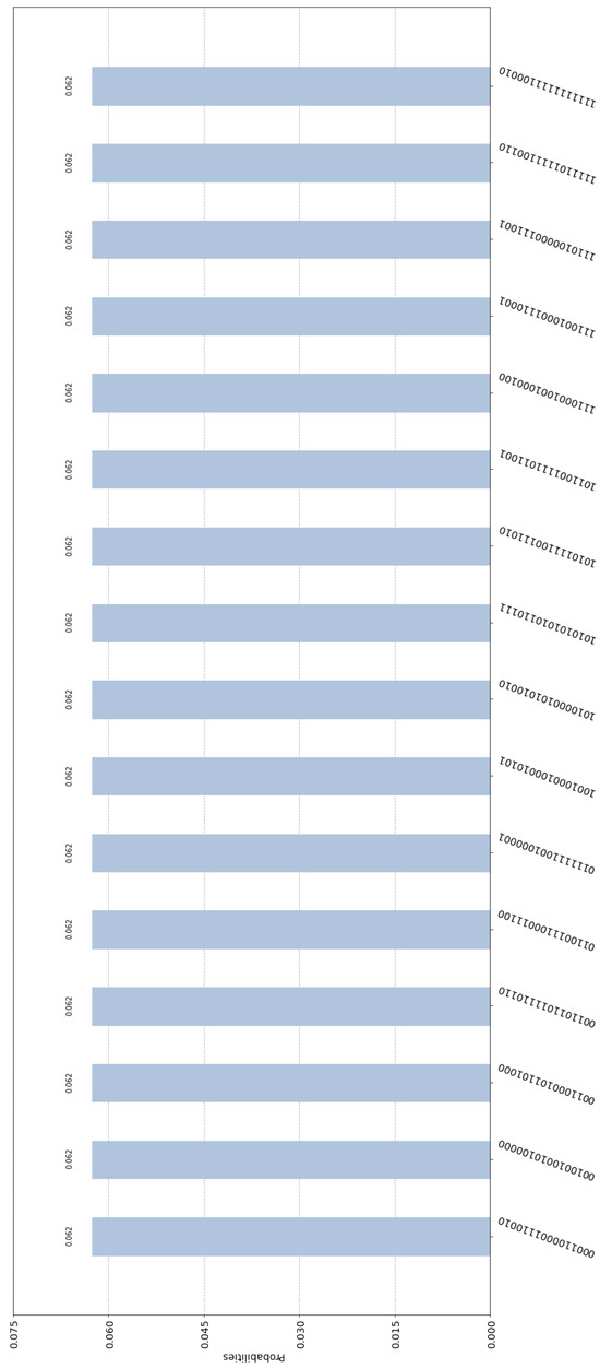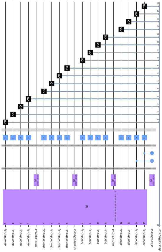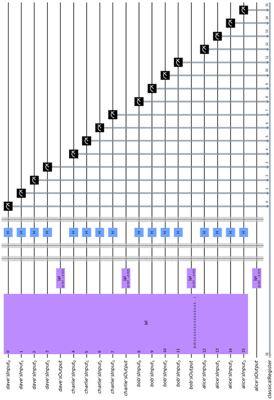 First, let us consider the case where one of the cryptographers, Alice, paid for the dinner. If Alice paid say EUR 12, then she embeds the binary representation of 12, namely, = 1100 in the entangled state of the composite circuit. This is easily achieved via CNOT gates. If we implement the general quantum circuit shown in Figure 4 in Qiskit, we end up with the specific implementation depicted in Figure 5. By measuring their input registers, Alice, Bob, Charlie, and Dave get one of the 216 = 65,536 equiprobable outcomes. For obvious technical limitations, we cannot show all these outcomes, since this would result in an unintelligible figure. Hence, we depict only 16 of them in Figure 6. It is straightforward to check that every possible outcome satisfies the Fundamental Correlation Property and verifies Equations (16) and (18). For example, we may examine the label of the first bar of the histogram contained in Figure 6, which is 0001 1000 0111 0010. This means that upon measurement the contents of Alice, Bob, Charlie, and Dave’s input registers are = 0001, = 1000, = 0111, and = 0010, respectively. These contents are shared among the four cryptographers, according to (D1) and (D2), and become common knowledge to all of them. Finally, they XOR them together to uncover the secret information, i.e., = 1100, which leads them to infer that one of them paid EUR 12 for the dinner. The crucial thing is that neither the measured contents , , , and of the input registers, nor the final private information can reveal the identity of the cryptographer who paid the bill.