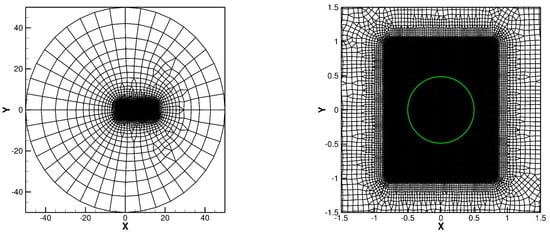 Entire unstructured mesh (left) and close-up view of the uniform mesh around the cylinder (right) for viscous flow past a circular cylinder. The cylinder boundary is represented by the green circle.