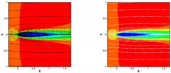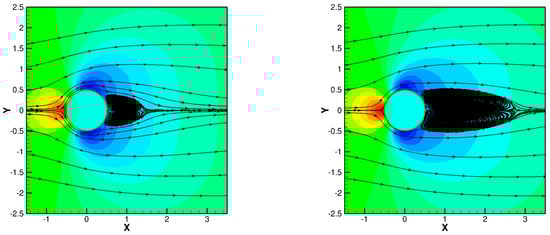 To further assess the performance of the present solver for the more complicated configuration, the flow past a stationary NACA-0012 airfoil is simulated. Following the setting in Ref. [10], the Reynolds number defined as is set as 500, where L denotes the chord length of the airfoil. The attack angle of 0° is considered. The computational domain of [−50 L, 50 L] × [−50 L, 50 L] discretized by 63,415 hybrid unstructured cells is presented in Figure 8, where the uniform mesh of the grid spacing h = 0.005 L is used in the region of [−0.2 L, 1.4 L] × [−0.15 L, 0.15 L] around the airfoil. The surface of the airfoil is represented by 412 uniformly distributed Lagrangian points. Figure 9 plots the pressure contours around the airfoil computed using the EIB-LBFS method and the IBM in FOAM-Extend 4.0. Both methods can obtain the symmetric flow pattern, but the result of the FOAM-Extend shows clear staircase patterns adjacent to the airfoil due to the cutout of the solid cells. Figure 10 further compares the u-velocity contours and streamlines around the airfoil calculated using these two methods. Although the velocity contours basically agree, it is obvious that the streamlines of the EIB-LBFS method do not penetrate the solid boundary, while minor penetrations are detected in the results computed using FOAM-Extend. The comparison of u-velocity and v-velocity profiles at various cross sections, as shown in Figure 11, shows good agreement with the reference data [59] for the present method, which indicates the exact satisfaction of the no-slip boundary condition for the present method. Furthermore, the computed by the present method is 0.1750, which agrees with the reference value of 0.1762 [59]. Thus, the capability and accuracy of the present method are well validated.