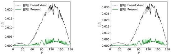 As shown in Figure 3, the present EIB-LBFS method can obtain the correct flow fields, which agree well with those in studies [37,40,43,44] for both cases of Re = 20 and 40. In addition, the streamlines have no unphysical penetration, which verifies the guarantee of the no-slip boundary condition by the EIB-LBFS method. To compare with the IBM in FOAM-Extend 4.0, Figure 4 compares the velocity magnitude versus the azimuth angle θ on the solid boundary. Clearly, the IBM in FOAM-Extend has one order of magnitude larger velocity magnitude than the present method on the same mesh. Such an observation confirms that the IBM in FOAM-Extend cannot enforce the no-slip boundary condition as accurately as the present method. This conclusion is further proved by the comparison of the pressure coefficient in the case of Re = 40 shown in Figure 5, where the surface pressure distribution computed by the FOAM-Extend 4.0 exhibits spurious oscillations. The better agreement of the result of the present method with the reference data [49] validates the more exact satisfaction of the no-slip boundary condition for the present EIB-LBFS method than the IBM in FOAM-Extend 4.0. For a quantitative comparison, Table 1 tabulates the drag coefficient and the geometrical quantities of the eddies, namely, the recirculation length and the separation angle obtained by both methods with some reference data [10,39,50,51,52,53]. It can be seen that, using the same mesh, the present method predicts good results within the range of the reference data, while the results from the IBM in FOAM-Extend have larger deviations due to the inaccurate satisfaction of the no-slip wall boundary condition.
