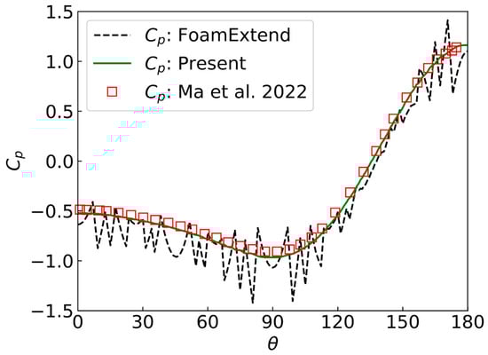 Comparison of pressure coefficient on the cylinder wall obtained using the EIB-LBFS method and the IBM in FOAM-Extend with the reference data from Ma et al. [49] for flow past a cylinder at Re = 40.