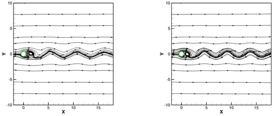 Streamlines around the cylinder obtained using the EIB-LBFS method for flow past a cylinder at Re =100 (left) and Re =200 (right).