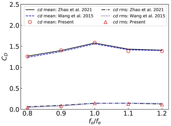 where Ae denotes the oscillating amplitude and fe is the excitation frequency. In the simulation, the parameters are set as Re = 185, Ae/Dc = 0.2 and fe/fo = 0.8, 0.9, 1.0, 1.1, and 1.2, where fo denotes the natural vortex shedding frequency of the cylinder at this Reynolds number. The same mesh as shown in Figure 2 is used for all computations.