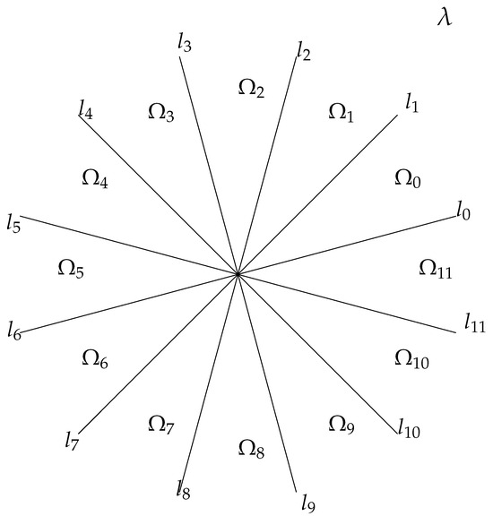 - The continuous spectrum of L fills up the set of rays , in the complex -plane for which (see Figure 1)where is any root of where , with and denoting the standard scalar product. Solving (27) leads to the rays being defined byEach ray is related to a subalgebra with root systems whose roots satisfyMore specifically, for this particular case we haveand .
