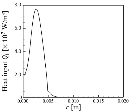 Table 2 shows the parameters used in this simulation. For the thermal conductivity of the ambient gas, the temperature dependence was considered. It was determined to be between 30.0 and 89.5 W·m−1·K−1 according to the temperature distribution of the gas phase shown in Figure 3.