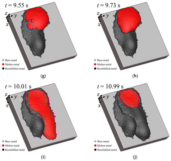 Thereafter, the volume of the molten pool increases again through a continuous supply of molten metal (Figure 5f). At s, when the volume of the molten pool increases sufficiently, the molten metal begins to flow in the -direction as shown in part C in Figure 5g. However, this overflow is held back, and the volume of the molten pool increases because the edges of the flow are quickly cooled and solidified at the solid–liquid interfaces (Figure 5h). After the molten metal accumulates sufficiently again, the molten metal overflows greatly in the -direction again, as shown in Figure 5i. The molten metal flows on the resolidified metal, which flowed down first. At s, the second molten metal flow is cooled and solidified entirely, as shown in Figure 5j.