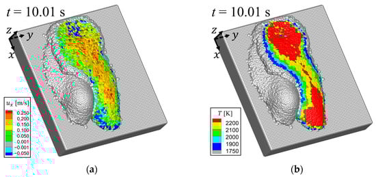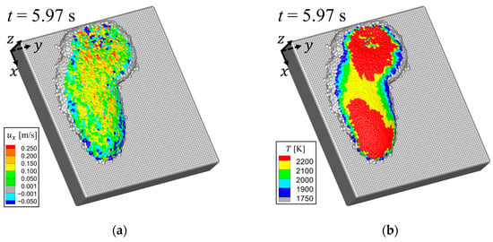 Figure 8 shows cross-sections at mm and at s. Only the particles located in 18.0 mm 20.0 mm are visualized. As shown in Figure 8a–c, the edges and bottom of the flow are cooled, solidified, and stationary. On the other hand, the top is still hot and flows. The solidified regions at the sides increase more in the -direction than on the inside. Therefore, the levee-like structure is formed. This is a similar structure to that shown in Figure 1.