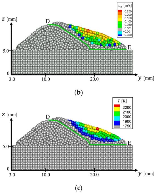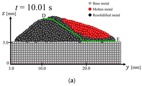 Figure 9 shows cross-sections at mm and at s. Only the particles located in 20.0 mm 22.0 mm are visualized. Line D–E traces the shape of the base metal and the resolidified metal, which flowed first. This line is used to distinguish the second flow from the first flow. The second molten metal flows on the base metal and the resolidified area of the first flow. During the second flow, the low-temperature solidified area increases from the solid–liquid interfaces indicated by the line D–E, as shown in Figure 9a–c. On the other hand, the molten metal away from the interfaces flows because its temperature is still higher than the solidification point. Therefore, the simulation considering the topographical change in the surface due to the solidification of the molten metal was successful.