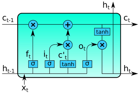 LSTM bears a similarity to the standard RNN formation, but it uses a specialized memory unit capable of retaining or discarding information over sequential data. The memory unit or cell has four layers that interact in a special way. The computation method is explained in Equation (12) [36], and the architecture is depicted in Figure 2.