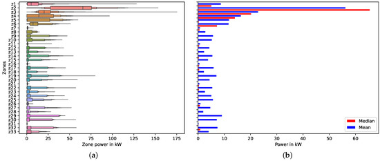 Figure 5a presents a letter–value plot for each thermal zone, and Figure 5b shows the horizontal bar plot of the median and mean values for each zone of the building. From these two plots, it is noticeable that most of the zones presented a mean power consumption that was lower than 10 kW and a median that was nearly 2 kW. Only a couple of the zones presented mean and median values greater than 20 kW.